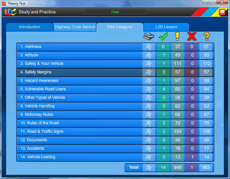 - Unlimited randomly generated Theory Test simulations (again properly balanced with the right number of questions from each category) just as on the real test.